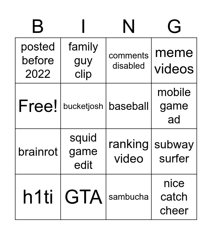 This bingo card has 16 words: GTA, subway surfer, comments disabled, posted before 2022, brainrot, family guy clip, ranking video, sambucha, Free!, bucketjosh, h1ti, meme videos, squid game edit, mobile game ad, baseball and nice catch cheer.