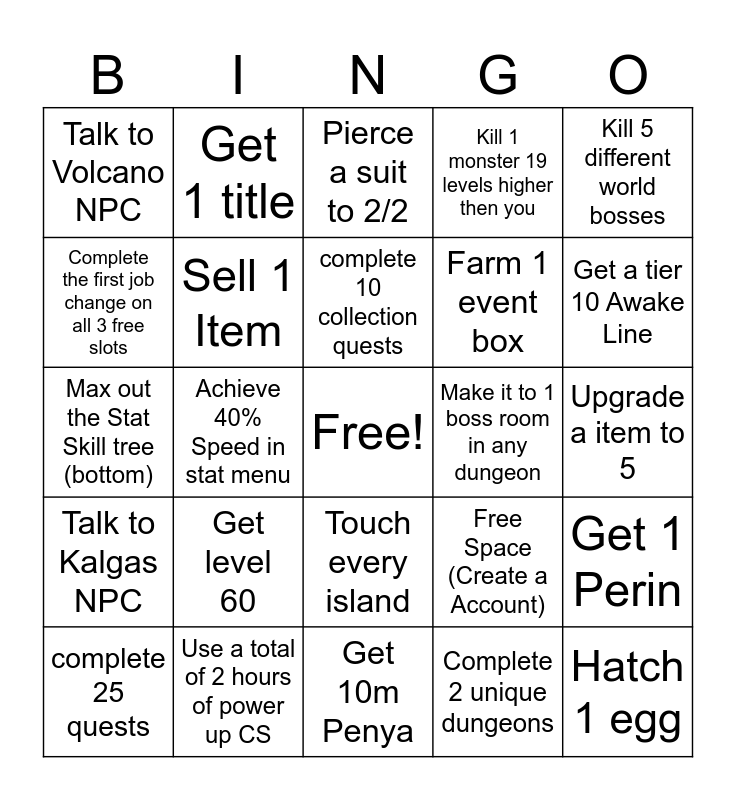 This bingo card has a free space and 25 words: Get level 60, Get 10m Penya, complete 10 collection quests, complete 25 quests, Kill 5 different world bosses, Talk to Volcano NPC, Complete the first job change on all 3 free slots, Get 1 title, Make it to 1 boss room in any dungeon, Touch every island, Farm 1 event box, Max out the Stat Skill tree (bottom), Free Space (Create a Account), Get 1 Perin, Sell 1 Item, get 4 unique green set parts (Dont have to be the same), Upgrade a item to 5, Pierce a suit to 2/2, Get a tier 10 Awake Line, Achieve 40% Speed in stat menu, Hatch 1 egg, Use a total of 2 hours of power up CS, Talk to Kalgas NPC, Kill 1 monster 19 levels higher then you and Complete 2 unique dungeons.
