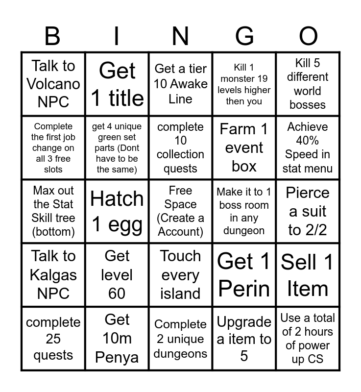 This bingo card has a free space and 24 words: Get level 60, Get 10m Penya, complete 10 collection quests, complete 25 quests, Kill 5 different world bosses, Talk to Volcano NPC, Complete the first job change on all 3 free slots, Get 1 title, Make it to 1 boss room in any dungeon, Touch every island, Farm 1 event box, Max out the Stat Skill tree (bottom), Get 1 Perin, Sell 1 Item, get 4 unique green set parts (Dont have to be the same), Upgrade a item to 5, Pierce a suit to 2/2, Get a tier 10 Awake Line, Achieve 40% Speed in stat menu, Hatch 1 egg, Use a total of 2 hours of power up CS, Talk to Kalgas NPC, Kill 1 monster 19 levels higher then you and Complete 2 unique dungeons.