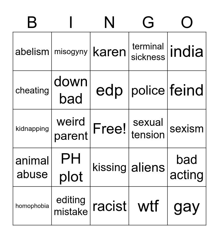 This bingo card has a free space and 24 words: PH plot, editing mistake, edp, homophobia, india, abelism, cheating, misogyny, sexual tension, kissing, police, kidnapping, aliens, bad acting, down bad, wtf, sexism, karen, feind, weird parent, gay, animal abuse, terminal sickness and racist.