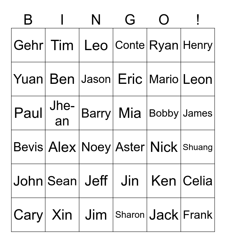 This bingo card has 36 words: Bevis, Alex, Jim, Eric, Bobby, James, Gehr, Xin, Leo, Jin, Mario, Henry, John, Jhe-an, Jason, Conte, Ken, Shuang, Yuan, Ben, Noey, Aster, Nick, Celia, Paul, Tim, Barry, Sharon, Ryan, Leon, Cary, Sean, Jeff, Mia, Jack and Frank.