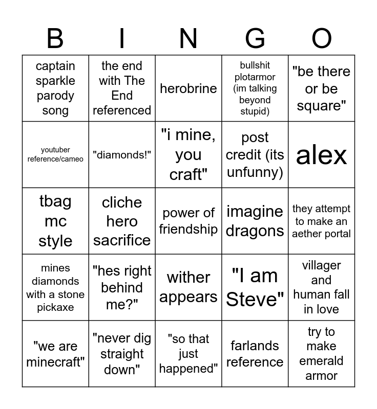 This bingo card has 25 words: "hes right behind me?", "so that just happened", "i mine, you craft", "we are minecraft", "be there or be square", captain sparkle parody song, youtuber reference/cameo, the end with The End referenced, imagine dragons, wither appears, post credit (its unfunny), tbag mc style, "I am Steve", villager and human fall in love, "diamonds!", try to make emerald armor, they attempt to make an aether portal, herobrine, alex, cliche hero sacrifice, power of friendship, "never dig straight down", mines diamonds with a stone pickaxe, bullshit plotarmor (im talking beyond stupid) and farlands reference.