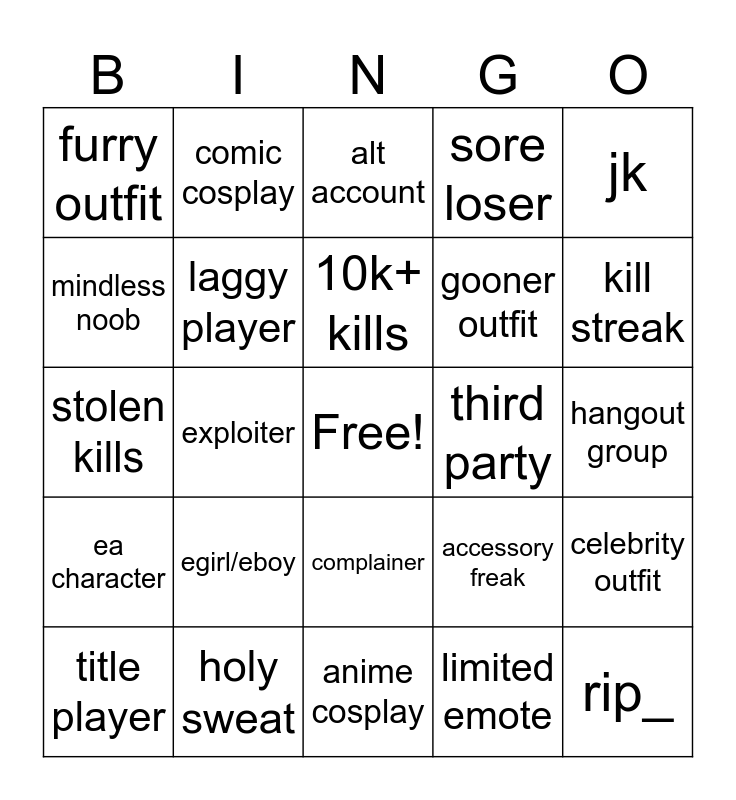 This bingo card has a free space and 24 words: egirl/eboy, holy sweat, 10k+ kills, title player, jk, furry outfit, mindless noob, comic cosplay, third party, complainer, gooner outfit, stolen kills, accessory freak, celebrity outfit, laggy player, limited emote, hangout group, alt account, kill streak, exploiter, rip_, ea character, sore loser and anime cosplay.