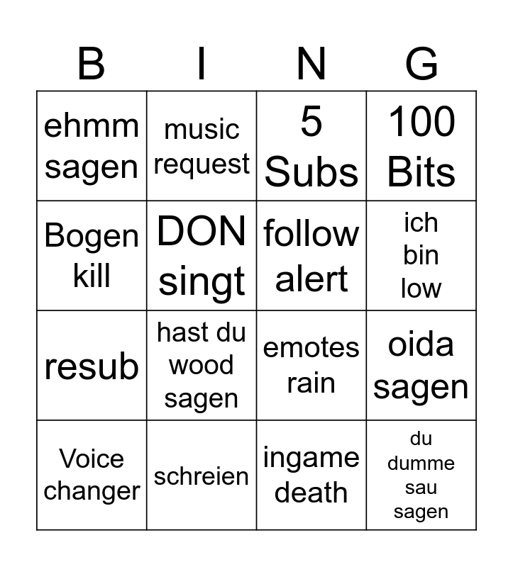 This bingo card has 16 words: schreien, oida sagen, 5 Subs, ehmm sagen, resub, music request, emotes rain, ingame death, Bogen kill, DON singt, Voice changer, 100 Bits, hast du wood sagen, ich bin low, follow alert and du dumme sau sagen.