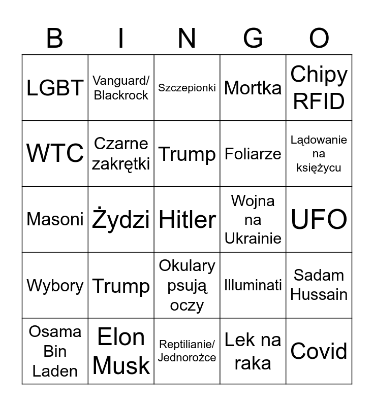 This bingo card has a free space and 29 words: Osama Bin Laden, CIA, Żydzi, 5G, LGBT, Szczepionki, Czarne zakrętki, Trump, Wojna na Ukrainie, Elon Musk, UFO, Covid, Reptilianie/ Jednorożce, Lek na raka, Lądowanie na księżycu, Drony, Okulary psują oczy, Wybory, Chipy RFID, Masoni, Illuminati, beef z dyrektorem, Foliarze, WTC, Mortka, Vanguard/ Blackrock, Sadam Hussain, Trump and Chińska aplikacja za 4mln$.