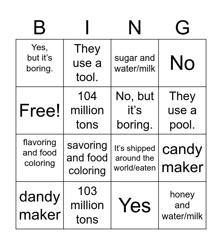 This bingo card has 16 words: 103 million tons, candy maker, sugar and water/milk, Yes, but it’s boring., flavoring and food coloring, They use a tool., It’s shipped around the world/eaten, Yes, Free!, 104 million tons, dandy maker, No, savoring and food coloring, They use a pool., No, but it’s boring. and honey and water/milk.
