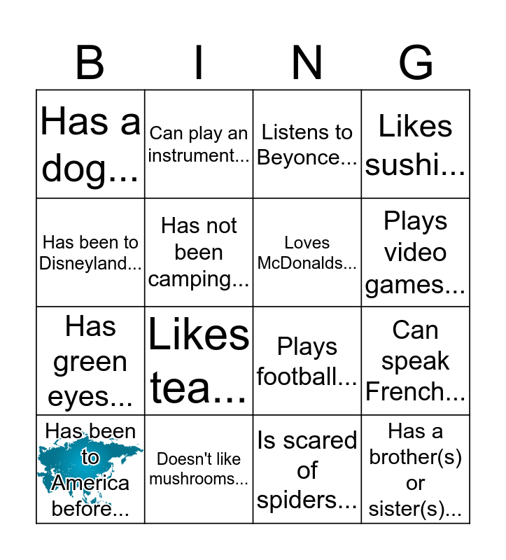 This bingo card has 1 images, a free space and 15 words: Has been to America before..., Has a brother(s) or sister(s)..., Listens to Beyonce..., Has a dog..., Plays video games..., Has been to Disneyland..., Likes tea..., Is scared of spiders..., Has not been camping..., Has green eyes..., Can speak French..., Likes sushi..., Loves McDonalds..., Can play an instrument... and Doesn't like mushrooms....