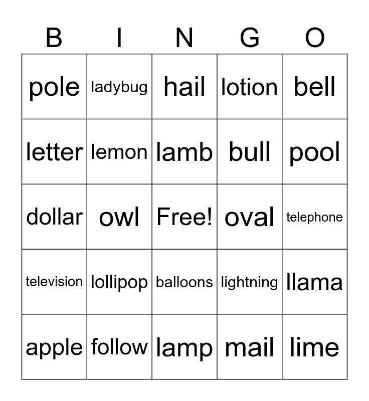 This bingo card has a free space and 51 words: lizard, lime, lips, lamp, lollipop, laundry, ladybug, leaf, letter, love, lemon, lotion, llama, lightning, lion, lunch, lamb, oval, tall, bell, owl, mail, pole, bull, whale, angel, pool, snail, apple, hail, girl, ball, people, toilet, melon, follow, family, silly, hello, elephant, telephone, television, wallet, envelope, salad, olives, dollar, colour, police, balloons and pillow.