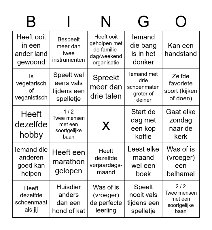 This bingo card has a free space and 24 words: Heeft een marathon gelopen, Huisdier anders dan een hond of kat, Spreekt meer dan drie talen, Heeft dezelfde schoenmaat als jij, Kan een handstand, Heeft ooit in een ander land gewoond, Is vegetarisch of veganistisch, Bespeelt meer dan twee instrumenten, Start de dag met een kop koffie, Heeft dezelfde verjaardags- maand, Iemand met drie schoenmaten groter of kleiner, Heeft dezelfde hobby, Leest elke maand wel een boek, Was of is (vroeger) een belhamel, Speelt wel eens vals tijdens een spelletje, Speelt nooit vals tijdens een spelletje, Gaat elke zondag naar de kerk, Heeft ooit geholpen met de familie-dag/weekend organisatie, Zelfde favoriete sport (kijken of doen), 1 / 2 Twee mensen met een soortgelijke baan, 2 / 2 Twee mensen met een soortgelijke baan, Iemand die anderen goed kan helpen, Iemand die bang is in het donker and Was of is (vroeger) de perfecte leerling.