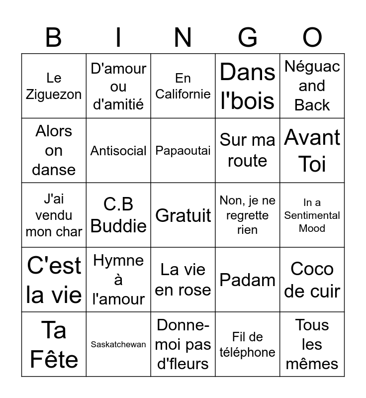 This bingo card has a free space and 44 words: Formidable, Tous les mêmes, carmen, Ta Fête, On écrit sur les murs, Fil de téléphone, En Californie, Limonade, Néguac and Back, Saskatchewan, Dans l'bois, Non, je ne regrette rien, La vie en rose, Hymne à l'amour, Charlie, Donne-moi pas d'fleurs, Dekshoo, J'ai vendu mon char, Dernière Danse, Avant Toi, D'amour ou d'amitié, Amour, Clair de Lune, Le Ziguezon, Mon Coeur Fait Vroum, In a Sentimental Mood, Take the "a" train, C.O.B.R.A, Padam, C'est la vie, J'ai mangé trop de patates frites, Coco de cuir, Crazy carpet, La monde a bien changé, C.B Buddie, Au bord du lac Bijou, La foule, Petit papa noël, Papaoutai, Alors on danse, Sur ma route, Coton Ouaté, Antisocial and Waterloo.