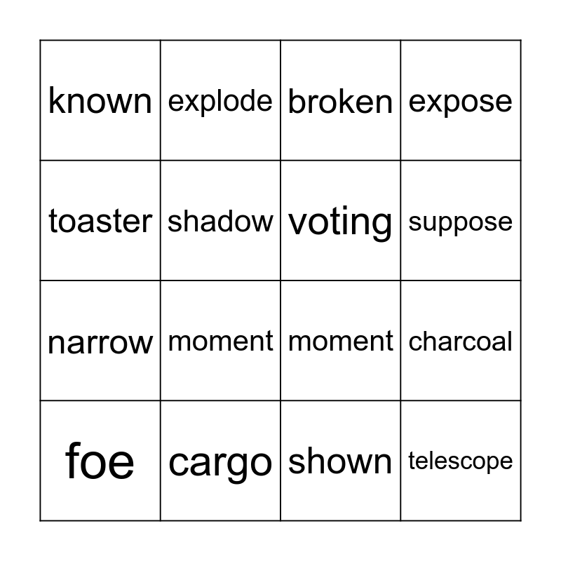 This bingo card has 24 words: meadow, tiptoe, suppose, compose, toaster, known, shadow, explode, cargo, unload, narrow, moment, coaster, arrow, voting, oboe, shown, broken, moment, charcoal, foe, telescope, expose and cocoa.