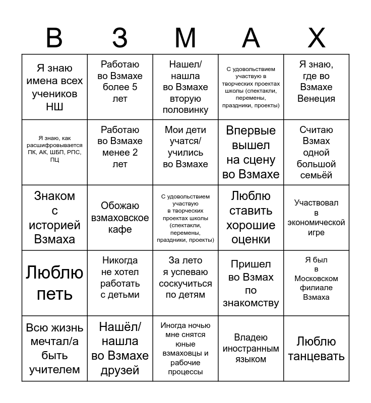 This bingo card has a free space and 24 words: Всю жизнь мечтал/а быть учителем, Никогда не хотел работать с детьми, Мои дети учатся/учились во Взмахе, Владею иностранным языком, Я знаю, где во Взмахе Венеция, Я знаю имена всех учеников НШ, Работаю во Взмахе более 5 лет, Нашел/нашла во Взмахе вторую половинку, Люблю ставить хорошие оценки, Участвовал в экономической игре, Знаком с историей Взмаха, Работаю во Взмахе менее 2 лет, Пришел во Взмах по знакомству, Я был в Московском филиале Взмаха, Я знаю, как расшифровывается ПК, АК, ШБП, РПС, ПЦ, Нашёл/нашла во Взмахе друзей, Иногда ночью мне снятся юные взмаховцы и рабочие процессы, С удовольствием участвую в творческих проектах школы (спектакли, перемены, праздники, проекты), Считаю Взмах одной большой семьёй, Люблю петь, Обожаю взмаховское кафе, За лето я успеваю соскучиться по детям, Впервые вышел на сцену во Взмахе and Люблю танцевать.