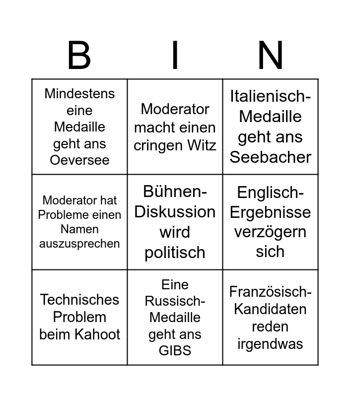 This bingo card has a free space and 8 words: Englisch-Ergebnisse verzögern sich, Italienisch-Medaille geht ans Seebacher, Moderator macht einen cringen Witz, Technisches Problem beim Kahoot, Mindestens eine Medaille geht ans Oeversee, Französisch-Kandidaten reden irgendwas, Moderator hat Probleme einen Namen auszusprechen and Eine Russisch-Medaille geht ans GIBS.