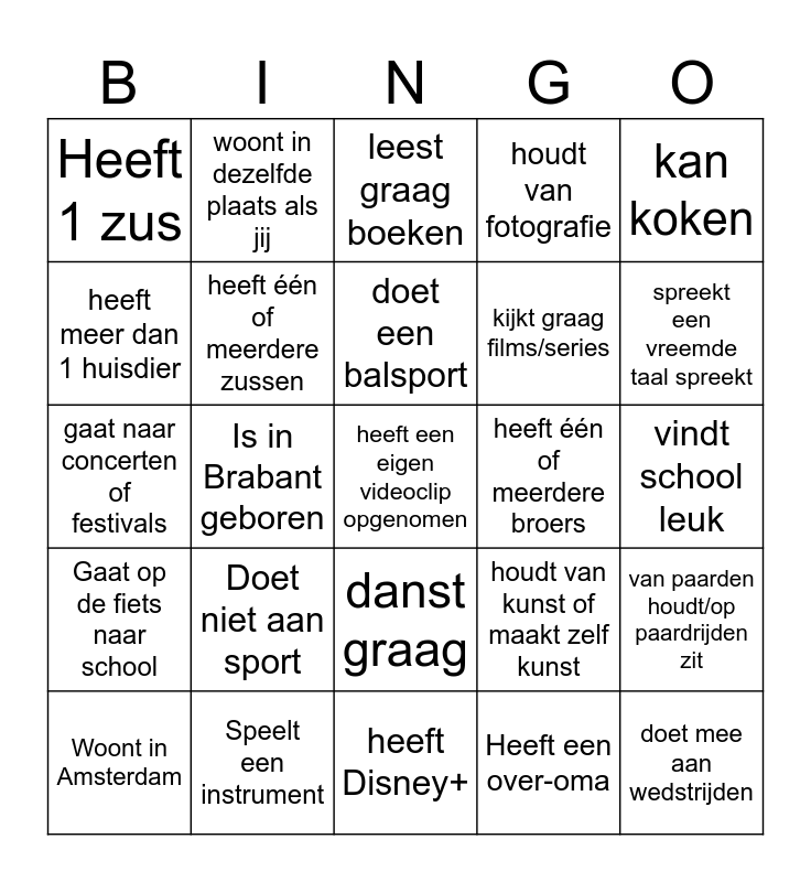 This bingo card has a free space and 24 words: Doet niet aan sport, Speelt een instrument, doet een balsport, Woont in Amsterdam, kan koken, Heeft 1 zus, heeft meer dan 1 huisdier, woont in dezelfde plaats als jij, heeft één of meerdere broers, danst graag, kijkt graag films/series, gaat naar concerten of festivals, houdt van kunst of maakt zelf kunst, van paarden houdt/op paardrijden zit, heeft één of meerdere zussen, Heeft een over-oma, vindt school leuk, leest graag boeken, spreekt een vreemde taal spreekt, Is in Brabant geboren, doet mee aan wedstrijden, Gaat op de fiets naar school, houdt van fotografie and heeft Disney+.