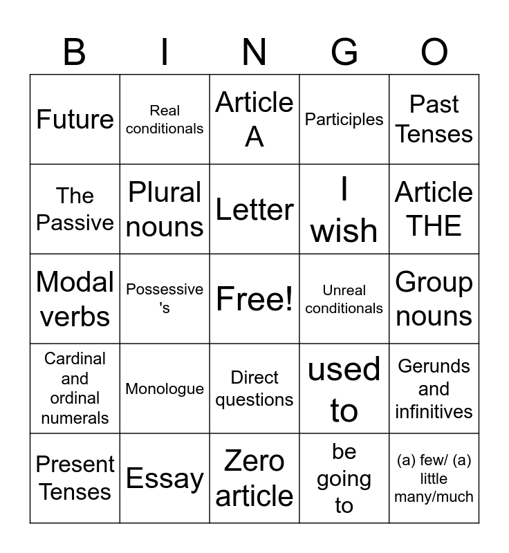 This bingo card has a free space and 24 words: Monologue, Essay, Letter, Present Tenses, Past Tenses, Future, The Passive, Real conditionals, Unreal conditionals, Direct questions, I wish, Modal verbs, used to, Gerunds and infinitives, Plural nouns, be going to, Group nouns, Article A, Article THE, Possessive 's, (a) few/ (a) little many/much, Cardinal and ordinal numerals, Participles and Zero article.