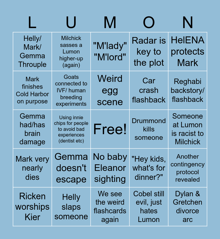 This bingo card has a free space and 24 words: Gemma doesn't escape, Helly slaps someone, Weird egg scene, Ricken worships Kier, HelENA protects Mark, Helly/ Mark/ Gemma Throuple, Mark finishes Cold Harbor on purpose, Milchick sasses a Lumon higher-up (again), Drummond kills someone, No baby Eleanor sighting, Car crash flashback, Gemma had/has brain damage, "Hey kids, what's for dinner?", Another contingency protocol revealed, Goats connected to IVF/ human breeding experiments, Cobel still evil, just hates Lumon, Someone at Lumon is racist to Milchick, "M'lady" "M'lord", Reghabi backstory/ flashback, Using innie chips for people to avoid bad experiences (dentist etc), Dylan & Gretchen divorce arc, Mark very nearly dies, Radar is key to the plot and We see the weird flashcards again.