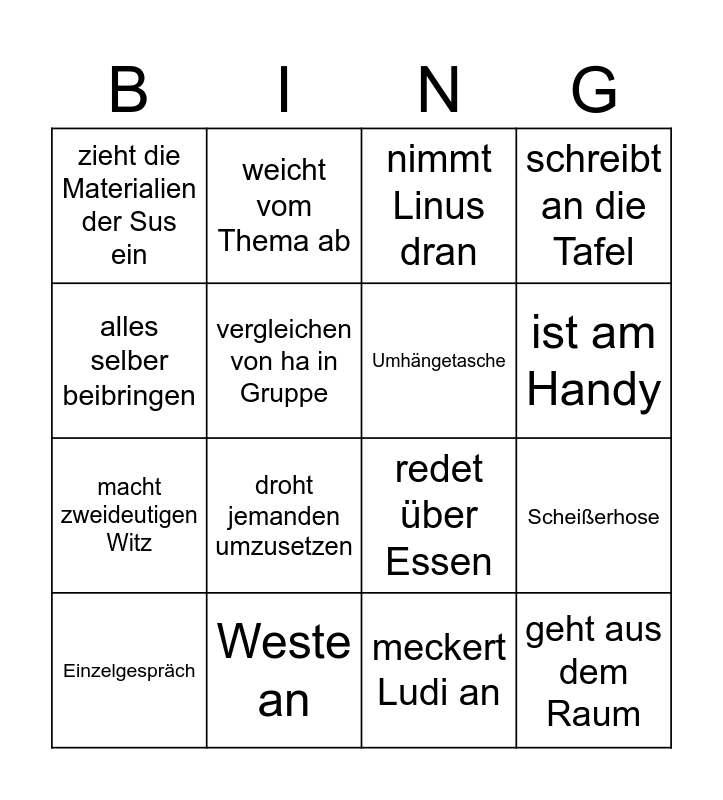 This bingo card has 16 words: Weste an, Scheißerhose, nimmt Linus dran, zieht die Materialien der Sus ein, macht zweideutigen Witz, weicht vom Thema ab, redet über Essen, meckert Ludi an, alles selber beibringen, vergleichen von ha in Gruppe, Einzelgespräch, schreibt an die Tafel, droht jemanden umzusetzen, ist am Handy, Umhängetasche and geht aus dem Raum.