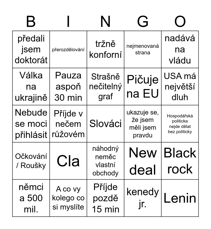 This bingo card has a free space and 24 words: Cla, A co vy kolego co si myslíte, Strašně nečitelný graf, němci a 500 mil., nadává na vládu, předali jsem doktorát, Válka na ukrajině, přerozdělování, ukazuje se, že jsem měli jsem pravdu, náhodný neměc vlastní obchody, Pičuje na EU, Nebude se moci přihlásit, New deal, Black rock, Pauza aspoň 30 min, kenedy jr., Hospodářská politicka nejde dělat bez politicky, tržně konforní, USA má největší dluh, Příjde v nečem růžovém, Lenin, Očkování / Roušky, nejmenovaná strana and Příjde pozdě 15 min.