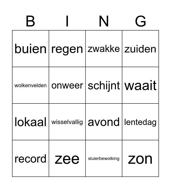 This bingo card has 32 words: zachte, zonnige, lentedag, temperatuur, zon, schijnt, wolkenvelden, lucht, regen, droog, waait, zwakke, graden, waaien, zee, stranden, helder, avond, nacht, kustgebied, mist, matige, sluierbewolking, krachtige, record, zuiden, lokaal, onweer, buien, daalt, stijgt and wisselvallig.