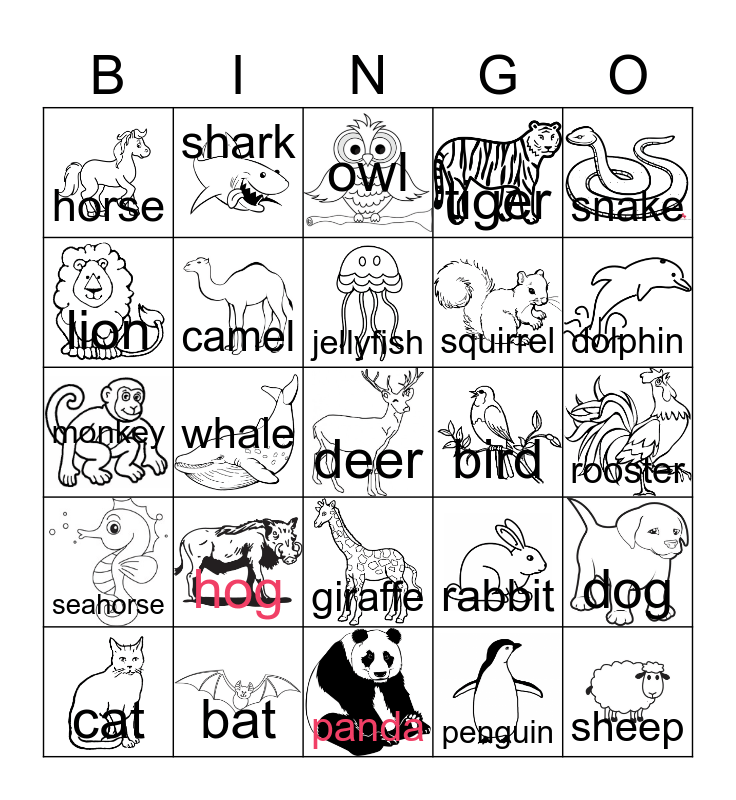 This bingo card has 35 images and 35 words: elephant, zebra, bear, camel, giraffe, tiger, lion, leopard, jellyfish, hippo, monkey, snake, turtle, rhino, horse, bird, penguin, whale, seahorse, deer, rabbit, cat, dog, bat, owl, dolphin, sheep, cow, squirrel, rooster, pig, panda, hog, shark and crocodile.