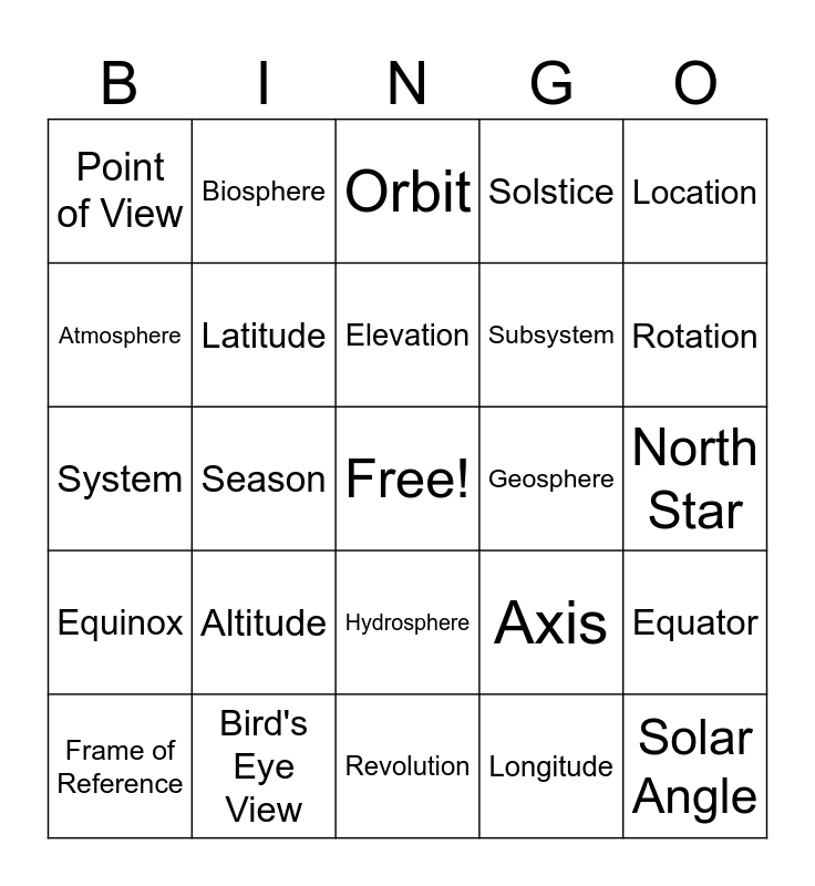 This bingo card has a free space and 24 words: Altitude, Bird's Eye View, Elevation, Frame of Reference, Location, Point of View, Atmosphere, Biosphere, Geosphere, Hydrosphere, Subsystem, System, Axis, Equator, Latitude, Longitude, North Star, Orbit, Rotation, Season, Solar Angle, Equinox, Solstice and Revolution.