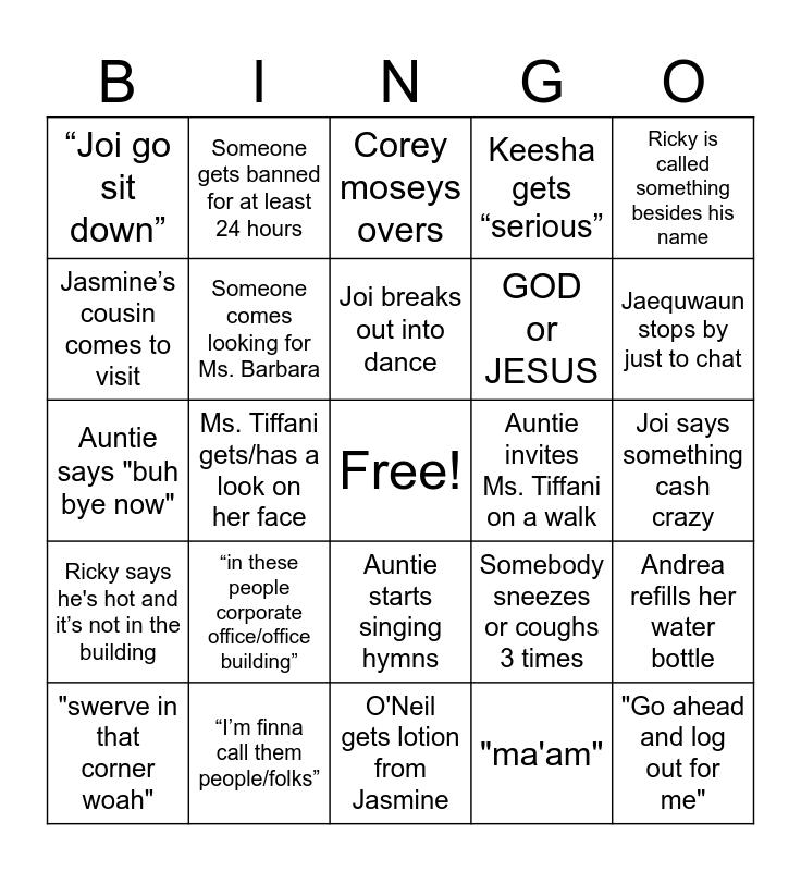 This bingo card has a free space and 24 words: “in these people corporate office/office building”, “I’m finna call them people/folks”, Joi breaks out into dance, "swerve in that corner woah", Ricky is called something besides his name, “Joi go sit down”, Jasmine’s cousin comes to visit, Someone gets banned for at least 24 hours, Auntie invites Ms. Tiffani on a walk, Auntie starts singing hymns, GOD or JESUS, Auntie says "buh bye now", Somebody sneezes or coughs 3 times, Andrea refills her water bottle, Someone comes looking for Ms. Barbara, "ma'am", Joi says something cash crazy, Corey moseys overs, Jaequwaun stops by just to chat, Ms. Tiffani gets/has a look on her face, "Go ahead and log out for me", Ricky says he's hot and it’s not in the building, Keesha gets “serious” and O'Neil gets lotion from Jasmine.