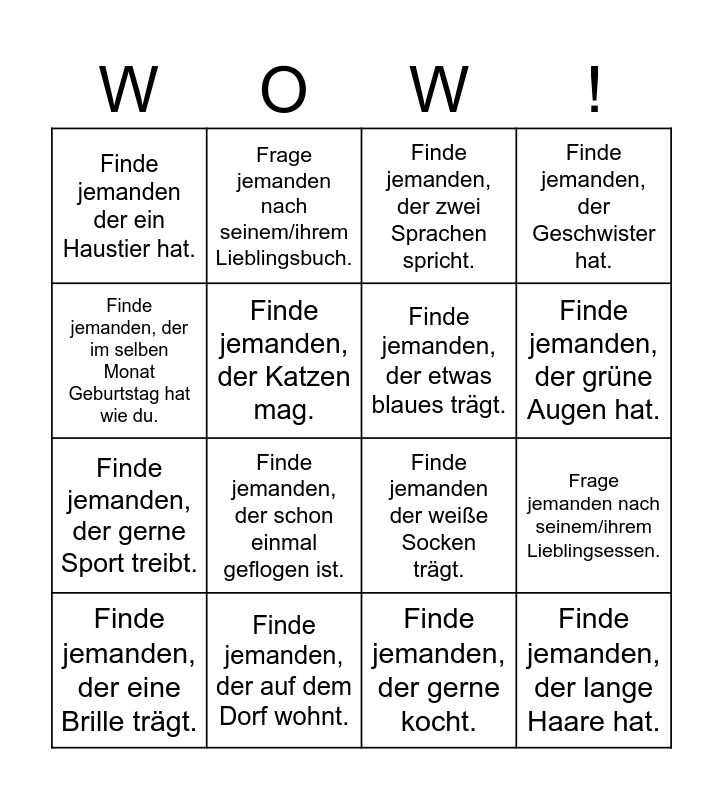 This bingo card has 16 words: Finde jemanden, der auf dem Dorf wohnt., Frage jemanden nach seinem/ihrem Lieblingsessen., Finde jemanden, der zwei Sprachen spricht., Finde jemanden der ein Haustier hat., Finde jemanden, der gerne Sport treibt., Frage jemanden nach seinem/ihrem Lieblingsbuch., Finde jemanden der weiße Socken trägt., Finde jemanden, der gerne kocht., Finde jemanden, der im selben Monat Geburtstag hat wie du., Finde jemanden, der Katzen mag., Finde jemanden, der eine Brille trägt., Finde jemanden, der Geschwister hat., Finde jemanden, der schon einmal geflogen ist., Finde jemanden, der grüne Augen hat., Finde jemanden, der etwas blaues trägt. and Finde jemanden, der lange Haare hat..