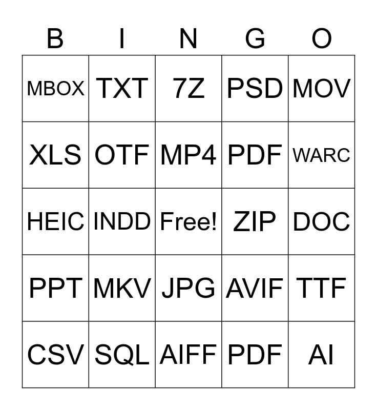 This bingo card has a free space and 38 words: FFV1, H.264, FLAC, OTF, TTF, MKV, MP4, AVI, MOV, PDF, INDD, PSD, AI, DOC, XLS, PPT, PUB, 7Z, RAR, ZIP, MBOX, SQL, WARC, CSV, TSV, AIFF, WAV, MP3, SVG, TIFF, JP2, JPG, PDF, TXT, RAW, AVIF, HEIC and PDF/A.
