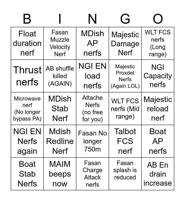 This bingo card has a free space and 24 words: Mdish Redline Nerf, MAIM beeps now, NGI EN load nerfs, Boat Stab Nerfs, WLT FCS nerfs (Long range), Float duration nerf, Thrust nerfs, Fasan Muzzle Velocity Nerf, WLT FCS nerfs (Mid range), Fasan No longer 750m, Majestic Proxdet Nerfs (Again LOL), Microwave nerf (No longer bypass PA), Talbot FCS nerf, Boat AP nerfs, AB shuffle killed (AGAIN), Fasan splash is reduced, Majestic reload nerf, MDish AP nerfs, NGI Capacity nerfs, MDish Stab Nerf, AB En drain increase, NGI EN Nerfs again, Majestic Damage Nerf and Fasan Charge Attack nerfs.