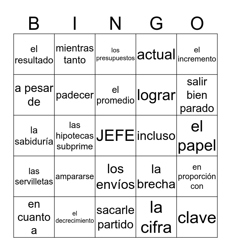 This bingo card has a free space and 26 words: los envíos, la cifra, el promedio, el decrecimiento, el incremento, el resultado, a pesar de, mientras tanto, el papel, la brecha, lograr, la sabiduría, en proporción con, en cuanto a, las hipotecas subprime, los ingresos, actual, las servilletas, los presupuestos, clave, salir bien parado, sacarle partido, incluso, ampararse, padecer and ordeñar.