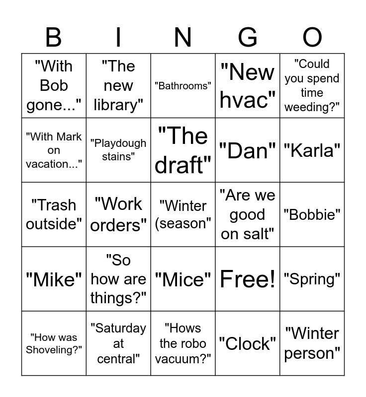 This bingo card has 25 words: "So how are things?", "Hows the robo vacuum?", "The draft", "How was Shoveling?", "Could you spend time weeding?", "With Bob gone...", "With Mark on vacation...", "The new library", "Are we good on salt", "Mice", "Dan", "Trash outside", Free!, "Spring", "Playdough stains", "Winter person", "Bobbie", "Bathrooms", "Karla", "Work orders", "Winter (season", "Saturday at central", "Mike", "New hvac" and "Clock".