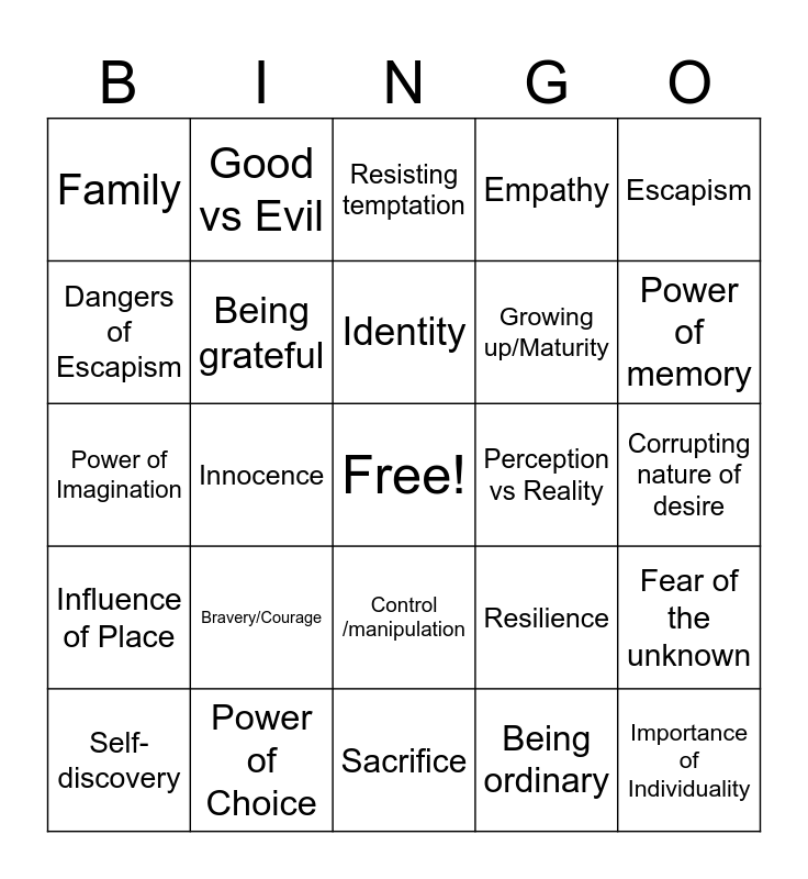 This bingo card has a free space and 24 words: Bravery/Courage, Power of Choice, Identity, Self-discovery, Escapism, Family, Dangers of Escapism, Good vs Evil, Perception vs Reality, Control /manipulation, Growing up/Maturity, Power of Imagination, Resilience, Fear of the unknown, Being grateful, Being ordinary, Corrupting nature of desire, Resisting temptation, Power of memory, Innocence, Importance of Individuality, Influence of Place, Empathy and Sacrifice.