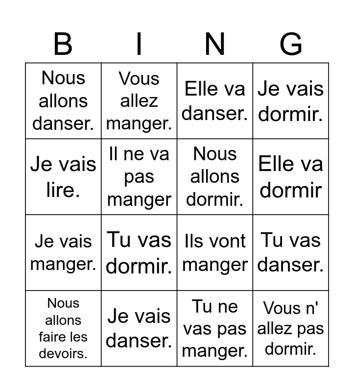 This bingo card has 16 words: Je vais danser., Tu vas danser., Elle va danser., Nous allons danser., Je vais manger., Vous allez manger., Ils vont manger, Tu ne vas pas manger., Je vais lire., Il ne va pas manger, Nous allons faire les devoirs., Je vais dormir., Tu vas dormir., Elle va dormir, Nous allons dormir. and Vous n' allez pas dormir..