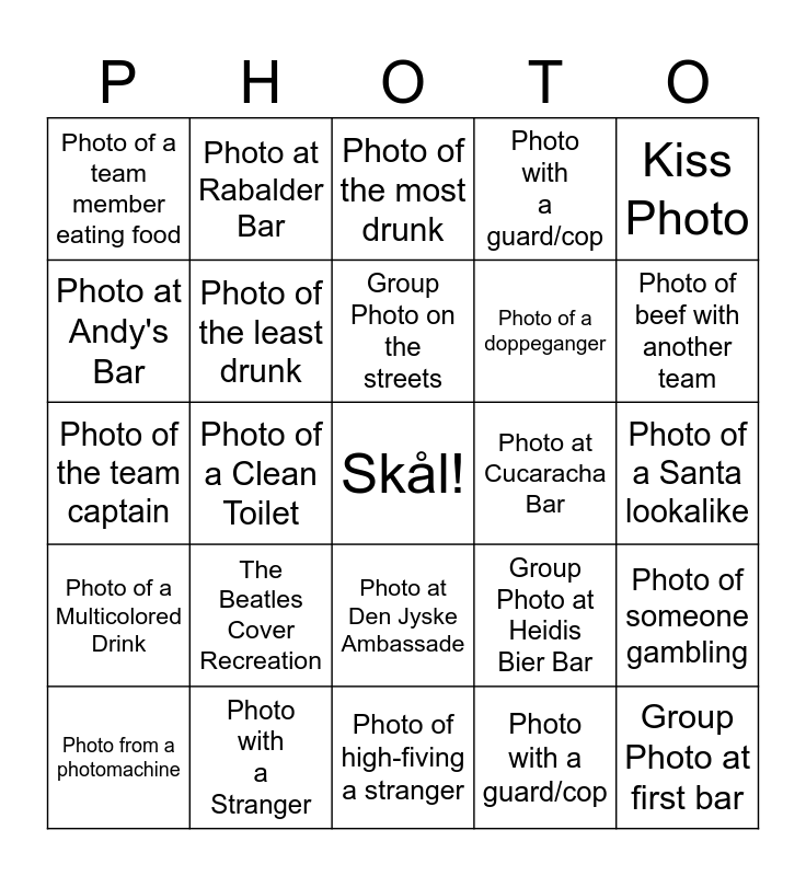 This bingo card has a free space and 24 words: The Beatles Cover Recreation, Photo with a Stranger, Group Photo on the streets, Photo from a photomachine, Kiss Photo, Photo of a team member eating food, Photo at Andy's Bar, Photo at Rabalder Bar, Photo at Cucaracha Bar, Photo at Den Jyske Ambassade, Photo of a doppeganger, Photo of the team captain, Group Photo at Heidis Bier Bar, Photo of someone gambling, Photo of the least drunk, Photo with a guard/cop, Photo of a Santa lookalike, Photo of the most drunk, Photo of beef with another team, Photo of a Clean Toilet, Group Photo at first bar, Photo of a Multicolored Drink, Photo with a guard/cop and Photo of high-fiving a stranger.
