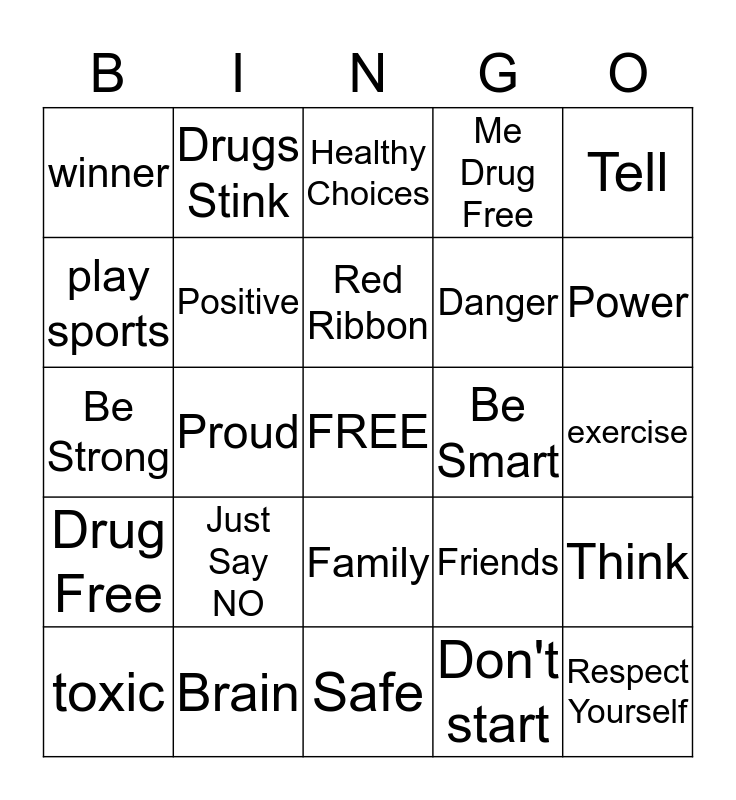 This bingo card has a free space and 24 words: Just Say NO, Brain, Red Ribbon, toxic, Tell, winner, play sports, Drugs Stink, Be Smart, Family, Danger, Be Strong, Friends, Think, Positive, Don't start, exercise, Healthy Choices, Power, Proud, Respect Yourself, Drug Free, Me Drug Free and Safe.
