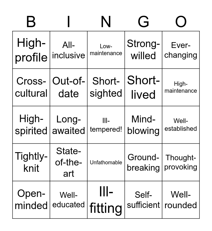 This bingo card has a free space and 24 words: State-of-the-art, Well-educated, Short-sighted, Open-minded, Ever-changing, High-profile, Cross-cultural, All-inclusive, Mind-blowing, Unfathomable, Short-lived, High-spirited, Ground-breaking, Thought-provoking, Out-of-date, Self-sufficient, Well-established, Low-maintenance, High-maintenance, Long-awaited, Well-rounded, Tightly-knit, Strong-willed and Ill-fitting.