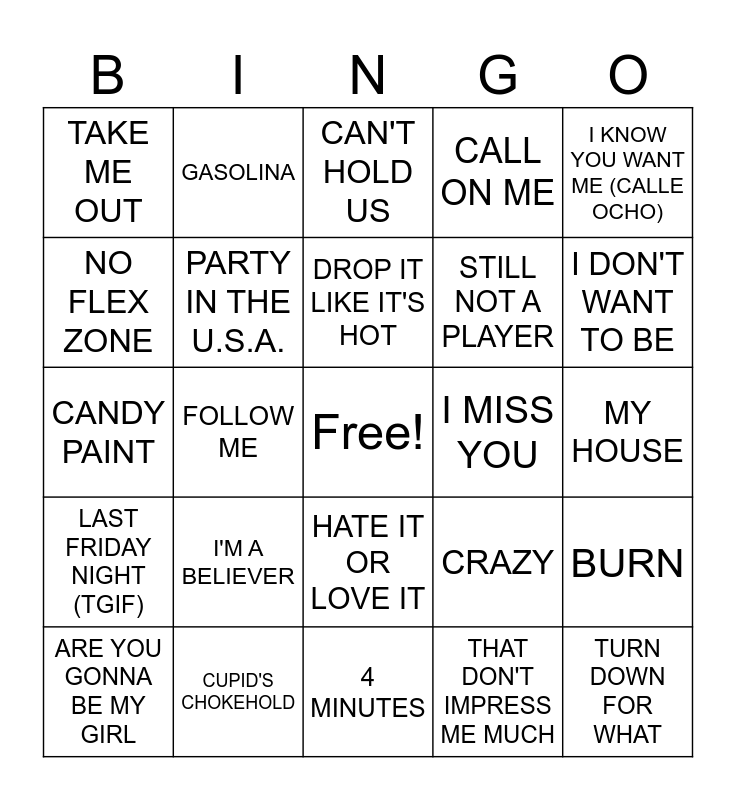 This bingo card has a free space and 36 words: HIPS DON'T LIE, DON'T CHA, YEAH!, PARTY IN THE U.S.A., CRAZY, LAST FRIDAY NIGHT (TGIF), DROP IT LIKE IT'S HOT, MR. BRIGHTSIDE, I KNOW YOU WANT ME (CALLE OCHO), ALL THE THINGS SHE SAID, FOLLOW ME, CALL ON ME, I BELIEVE IN A THING CALLED LOVE, I MISS YOU, I DON'T WANT TO BE, TAKE ME OUT, WOMANIZER, I'M A BELIEVER, TURN DOWN FOR WHAT, CAN'T HOLD US, MY HOUSE, BURN, CUPID'S CHOKEHOLD, ARE YOU GONNA BE MY GIRL, 4 MINUTES, GASOLINA, CANDY PAINT, FIND A WAY, STILL NOT A PLAYER, NO FLEX ZONE, DRUNK ON A PLANE, BEER NEVER BROKE MY HEART, THAT DON'T IMPRESS ME MUCH, HATE IT OR LOVE IT, PARTY and LATCH.