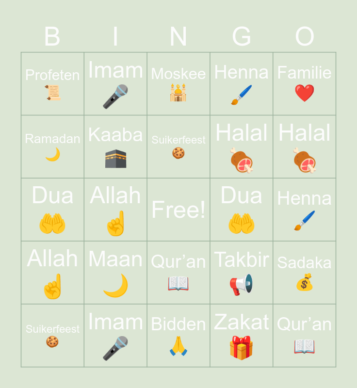 This bingo card has a free space and 50 words: Moskee π, Qurβan π, Eid Mubarak β¨, Bidden π, Maan π, Iftar π², Imam π€, Salam π, Ramadan π, Bismillah π·οΈ, Kaaba π, Henna ποΈ, Sadaka π°, Takbir π’, Snoep π¬, Offerfeest π, Suikerfeest πͺ, Dua π€², Wudu π°, Familie β€οΈ, Allah βοΈ, Zakatπ, Profeten π, Halal π, Vasten βοΈ, Profeten π, Halal π, Vasten βοΈ, Moskee π, Qurβan π, Eid Mubarak β¨, Bidden π, Maan π, Iftar π², Imam π€, Salam π, Ramadan π, Bismillah π·οΈ, Kaaba π, Henna ποΈ, Sadaka π°, Takbir π’, Snoep π¬, Offerfeest π, Suikerfeest πͺ, Dua π€², Wudu π°, Familie β€οΈ, Allah βοΈ and Zakatπ.