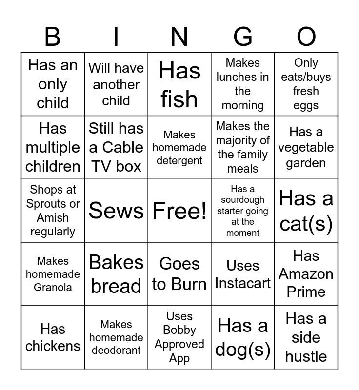 This bingo card has a free space and 24 words: Bakes bread, Makes homemade deodorant, Makes homemade detergent, Has chickens, Only eats/buys fresh eggs, Has an only child, Has multiple children, Will have another child, Has a sourdough starter going at the moment, Goes to Burn, Makes the majority of the family meals, Shops at Sprouts or Amish regularly, Uses Instacart, Has Amazon Prime, Still has a Cable TV box, Has a dog(s), Has a cat(s), Has fish, Has a vegetable garden, Sews, Has a side hustle, Makes homemade Granola, Makes lunches in the morning and Uses Bobby Approved App.