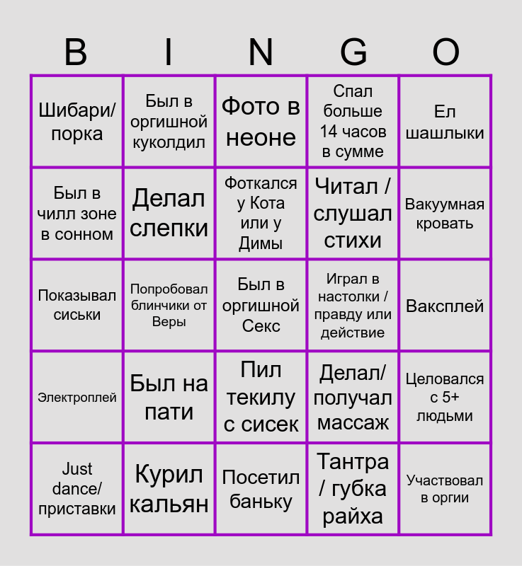 This bingo card has a free space and 24 words: Был на пати, Курил кальян, Фоткался у Кота или у Димы, Just dance/ приставки, Ел шашлыки, Шибари/ порка, Был в чилл зоне в сонном, Был в оргишной куколдил, Играл в настолки / правду или действие, Пил текилу с сисек, Читал /слушал стихи, Показывал сиськи, Делал/ получал массаж, Целовался с 5+ людьми, Делал слепки, Тантра / губка райха, Ваксплей, Фото в неоне, Вакуумная кровать, Попробовал блинчики от Веры, Участвовал в оргии, Электроплей, Спал больше 14 часов в сумме and Посетил баньку.