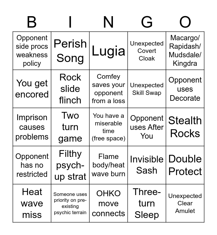 This bingo card has a free space and 33 words: Unconventional tera blast, Usually Useless move, Two turn game, Opponent DCs, Opponent has no restricted, Rock slide flinch, Macargo/ Rapidash/ Mudsdale/ Kingdra, Heat wave miss, Perish Song, Bastiodon, Comfey saves your opponent from a loss, Lugia, Eruption from a mon that isn't torkoal, Unexpected Feint, Opponent uses After You, Opponent uses Decorate, Someone uses priority on pre-existing psychic terrain, Imprison causes problems, Filthy psych-up strat, Invisible Sash, Flame body/heat wave burn, Hurricane Confusion, Opponent side procs weakness policy, Stealth Rocks, OHKO move connects, Unexpected Clear Amulet, Unexpected Covert Cloak, Unexpected Skill Swap, You get encored, Double Protect, Surprise Wide Guard, Three-turn Sleep and Mewtwo.