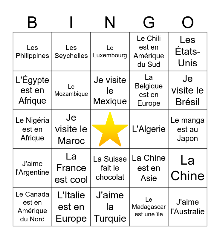 This bingo card has a free space and 24 words: La France est cool, L'Italie est en Europe, Je visite le Mexique, Le Canada est en Amérique du Nord, Les États-Unis, Les Philippines, L'Égypte est en Afrique, Les Seychelles, L'Algerie, La Suisse fait le chocolat, La Belgique est en Europe, Le Nigéria est en Afrique, La Chine est en Asie, La Chine, Le Mozambique, Le Madagascar est une île, Le manga est au Japon, Le Luxembourg, Je visite le Brésil, Je visite le Maroc, J'aime l'Australie, J'aime l'Argentine, Le Chili est en Amérique du Sud and J'aime la Turquie.