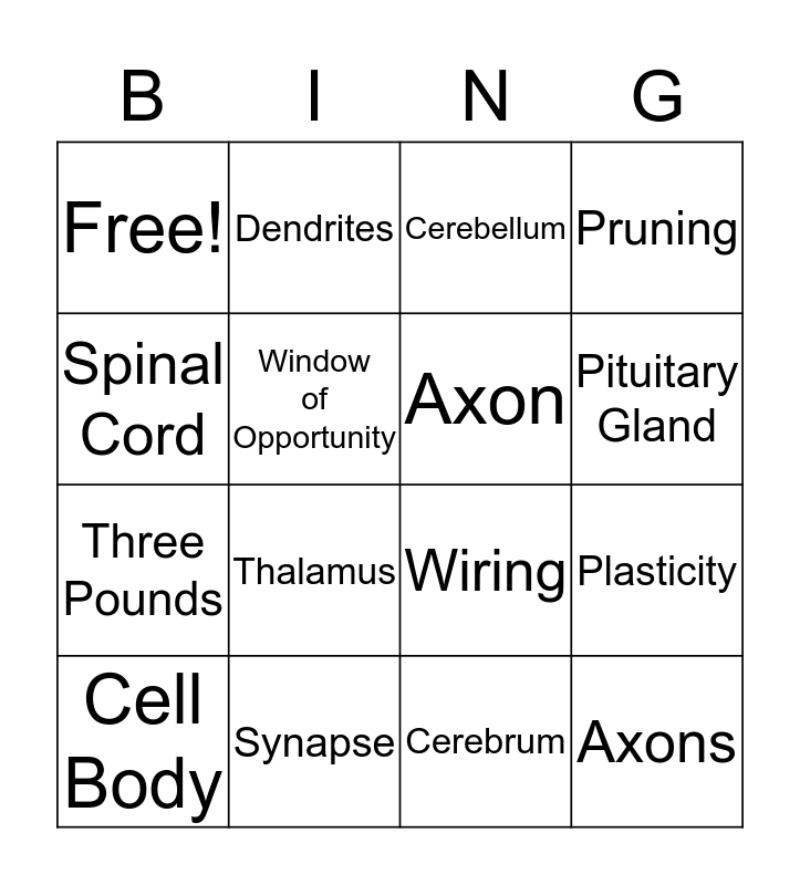 This bingo card has a free space and 15 words: Cell Body, Axons, Cerebellum, Free!, Pituitary Gland, Spinal Cord, Thalamus, Cerebrum, Window of Opportunity, Three Pounds, Plasticity, Pruning, Axon, Dendrites and Synapse.