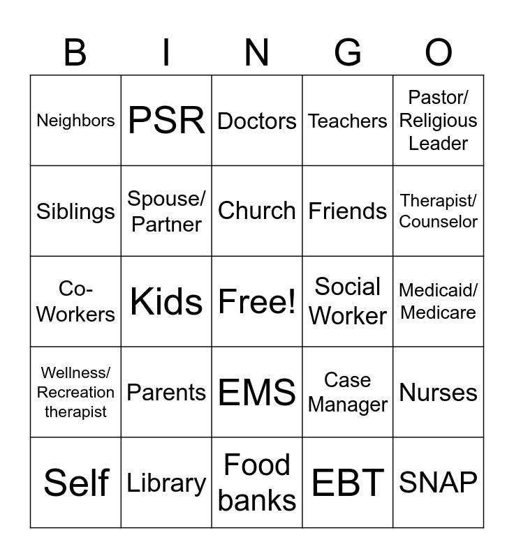 This bingo card has a free space and 24 words: Parents, Library, Church, Self, Pastor/ Religious Leader, Neighbors, Siblings, PSR, Social Worker, EMS, Friends, Co-Workers, Case Manager, Nurses, Spouse/ Partner, EBT, Medicaid/ Medicare, Doctors, Therapist/ Counselor, Kids, SNAP, Wellness/ Recreation therapist, Teachers and Food banks.