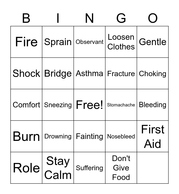 This bingo card has a free space and 24 words: Burn, Stay Calm, Fainting, Nosebleed, Gentle, Fire, Sprain, Observant, Fracture, First Aid, Shock, Bridge, Tactful, Stomachache, Choking, Role, Sneezing, Asthma, Loosen Clothes, Bleeding, Comfort, Drowning, Suffering and Don't Give Food.