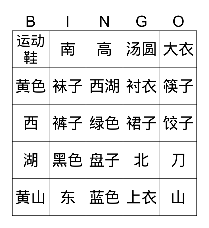 This bingo card has a free space and 24 words: 黑色, 东, 西湖, 黄山, 大衣, 运动鞋, 黄色, 南, 裙子, 盘子, 衬衣, 西, 北, 刀, 袜子, 上衣, 饺子, 高, 筷子, 裤子, 山, 湖, 汤圆 and 蓝色.