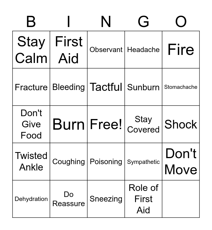 This bingo card has a free space and 24 words: Twisted Ankle, Do Reassure, Poisoning, Sympathetic, Fire, Stay Calm, First Aid, Observant, Sunburn, Don't Move, Fracture, Bleeding, Food Poisoning, Stay Covered, Stomachache, Dehydration, Burn, Tactful, Headache, Shock, Don't Give Food, Coughing, Sneezing and Role of First Aid.