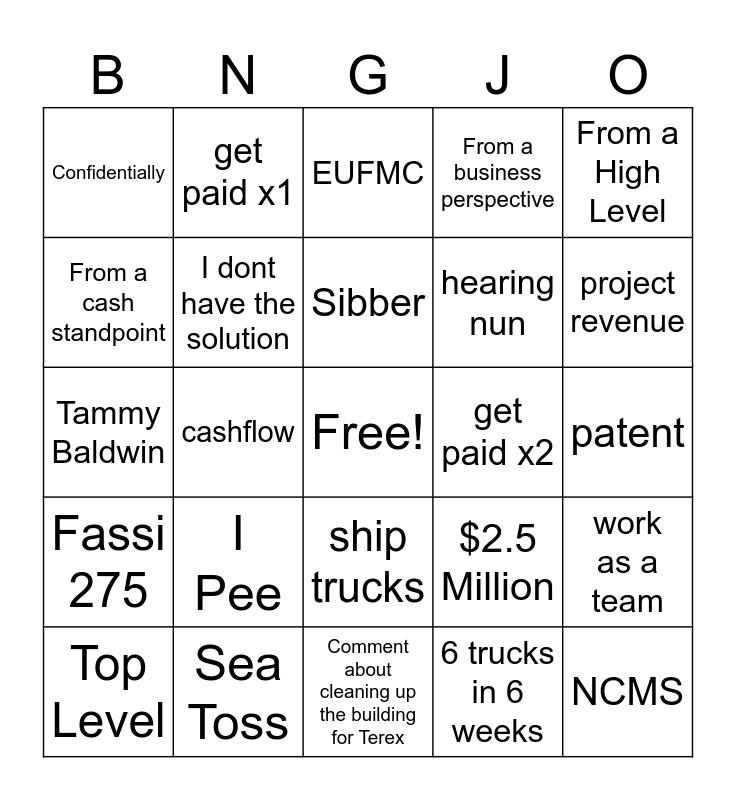 This bingo card has a free space and 24 words: I Pee, Sea Toss, Sibber, Top Level, From a High Level, Confidentially, From a cash standpoint, get paid x1, get paid x2, ship trucks, hearing nun, Tammy Baldwin, $2.5 Million, work as a team, I dont have the solution, 6 trucks in 6 weeks, patent, EUFMC, project revenue, cashflow, NCMS, Fassi 275, From a business perspective and Comment about cleaning up the building for Terex.