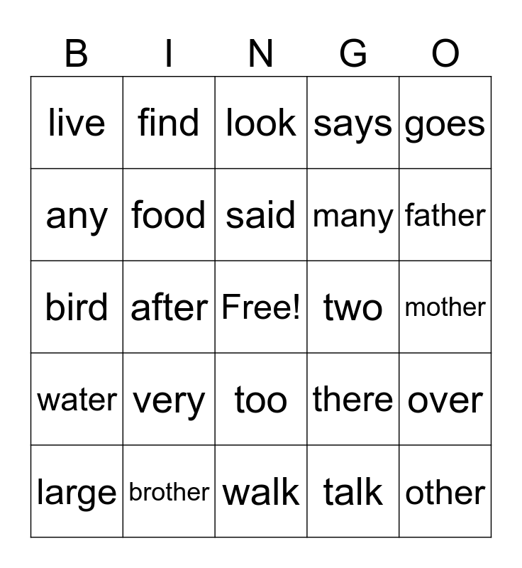 This bingo card has a free space and 29 words: large, every, after, been, live, look, food, very, two, brother, mother, other, walk, talk, father, their, too, water, goes, bird, there, where, many, any, says, find, over, said and here.