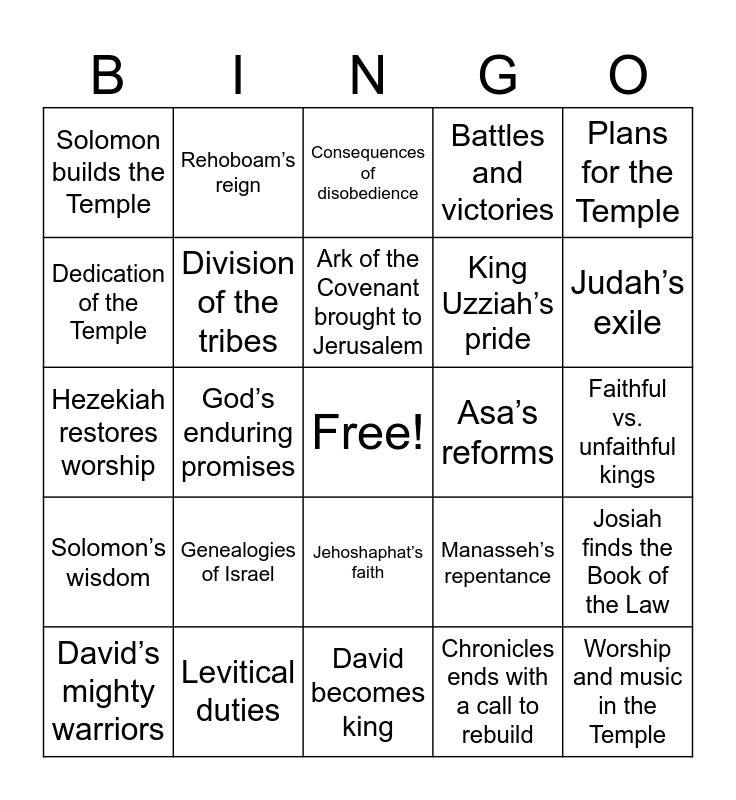 This bingo card has a free space and 25 words: Genealogies of Israel, David becomes king, Ark of the Covenant brought to Jerusalem, David’s mighty warriors, Plans for the Temple, Solomon builds the Temple, Dedication of the Temple, Rehoboam’s reign, Asa’s reforms, Jehoshaphat’s faith, King Uzziah’s pride, Hezekiah restores worship, Manasseh’s repentance, Josiah finds the Book of the Law, Division of the tribes, Prophets speak to the kings, Faithful vs. unfaithful kings, Consequences of disobedience, Judah’s exile, God’s enduring promises, Worship and music in the Temple, Levitical duties, Solomon’s wisdom, Battles and victories and Chronicles ends with a call to rebuild.